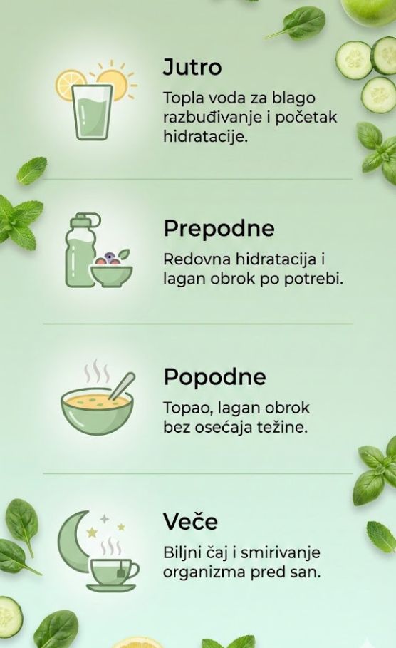 Dan zapoฤinjem ฤaลกom tople vode, po ลพelji sa malo limuna. Ovo sluลพi kao blago razbuฤivanje organizma nakon sna i prva hidratacija.